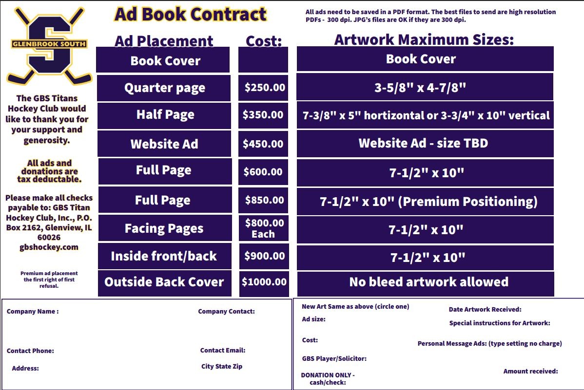 The sales of ADs for the Titan Hockey Club are used to offset your player's fees. Players are reimbursed 50% of the value of any AD they sell. The remaining 50% is applied toward the cost of producing the AD Book.